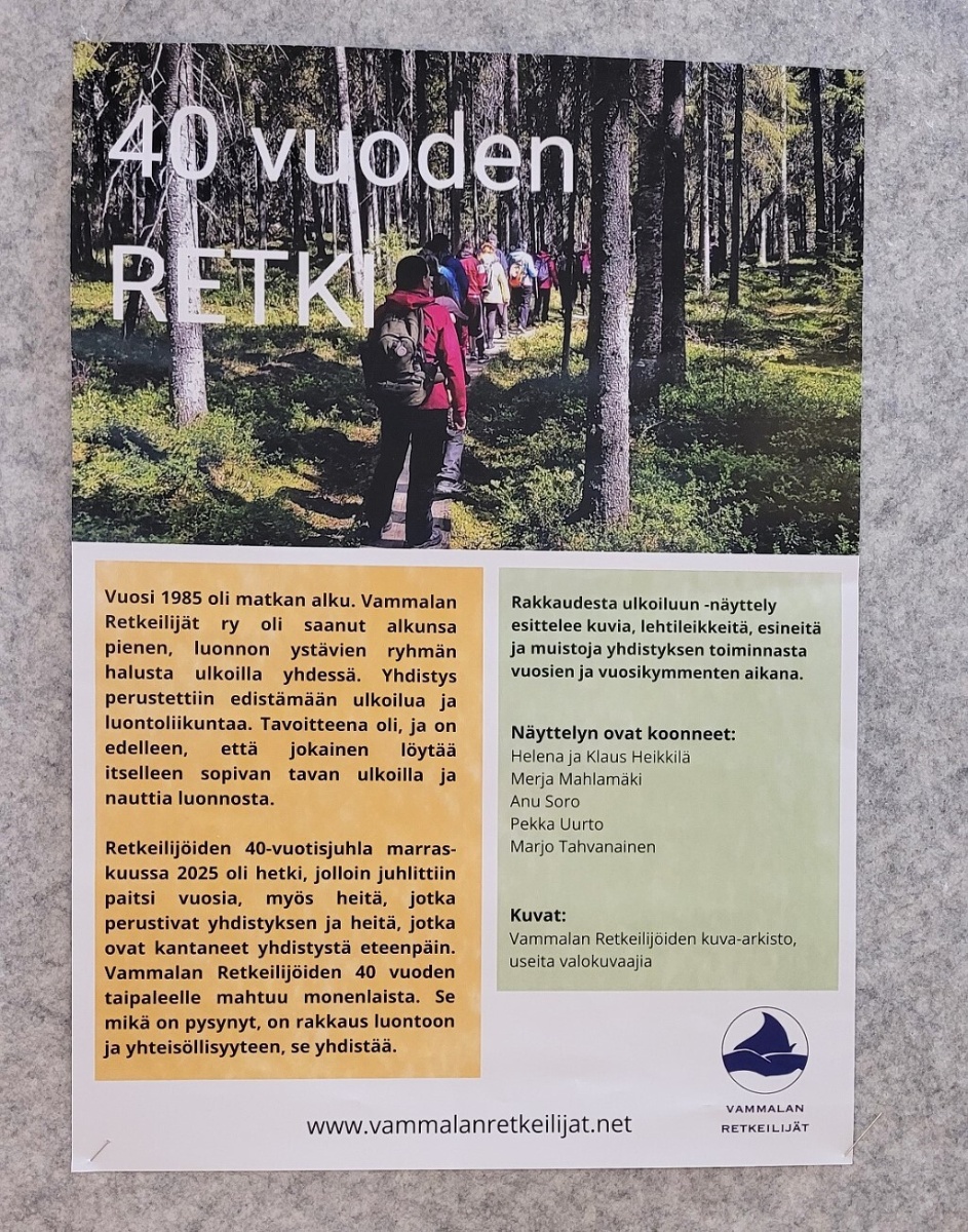Vammalan Retkeilijät ry vietti 40-vuotisjuhlaa marraskuussa 2025, jonka johdosta järjestettiin juhlanäyttely Sastamalan pääkirjastossa. Näyttelyssä oli esillä lehtileikkeitä, valokuvia ja esineitä, jotka kertoivat yhdistyksemme monipuolisesta toiminnasta vuosien ja vuosikymmenten aikana. Näyttely oli suosittu ja hyvää palautetta. Näyttely oli esillä helmikuussa 2026. Kuvat oli aseteltu esille teemoittain eli lajeittain. Esillä olivat teemat: hiihto, pyöräily, kirkkovenesoutu, melonta, retkeily, Akselin Vaellus, lapset- ja perheet, tapahtumat sekä talkootoiminta.